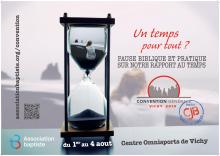 Convention Famille de notre Association Baptiste. Du 01 au 04 Août à Vichy. Thème "Un temps pour tout ?"... inviter le plus grand nombre à prendre une « pause » biblique pour réfléchir, méditer à notre gestion du temps. Rendez-vous sur : https://associationbaptiste.org/lire/convention-2019-presentation pour plus d'informations et trouver l'onglet « Formulaire d'inscription » en haut et à droite de la page